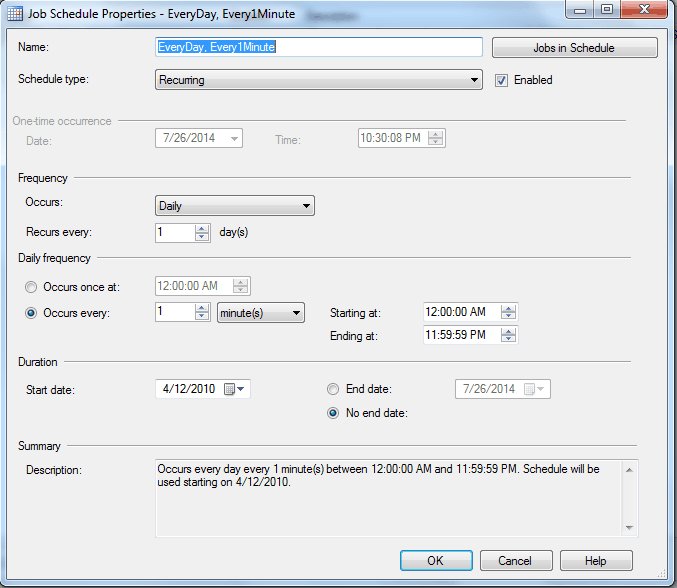 Figure 12 shows the schedule setup. We decided that one minute was the longest duration tolerance we wanted between the record being inserted and the email being sent to the recipient. You can see that the job runs every minute, every day.