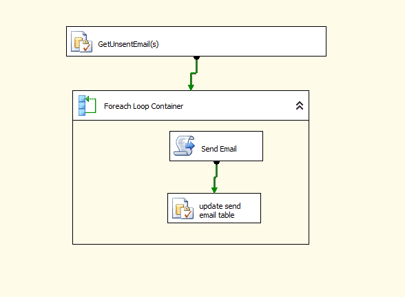 The GetUnsentEmail(s) SQL task executes a stored proc that gets all the records where sentEmail = false. The stored procedure it executes is here: