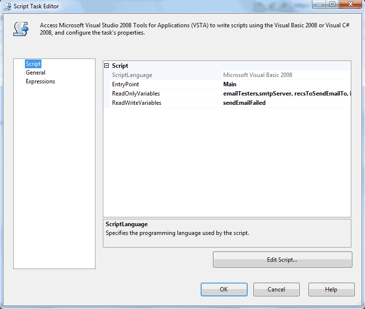 This is the "work horse" of the package. Simply (or is it sophisticatedly?) put, the task uses .NET's System.Net.Email class to send the email. We'll go into details about the script code later. For now, look at figure 8 and note the ReadOnlyVariables property. The task uses the values of those variables in its code to get the subject, body, recipient address, etc of the email it is going to send.