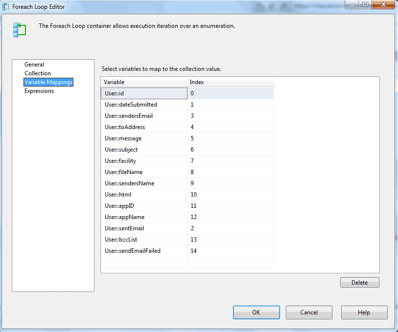 After the Collection is set up, the "Variable Mappings" is used to map the columns from the record set to the variables. In Figure 7 you can see that the Variable column contains the variable name in the format of User::VARIABLENAME. The "Index" column contains the index of the record's column.