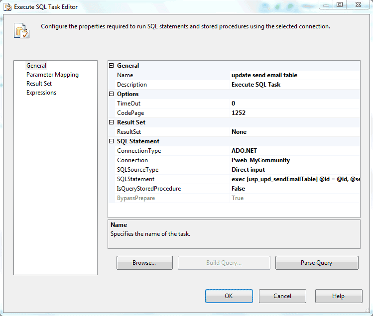 which means when executed, the SQL task executes a stored proc named usp_upd_SSISsendEmailTable and passes the package variables to the stored proc's parameters.