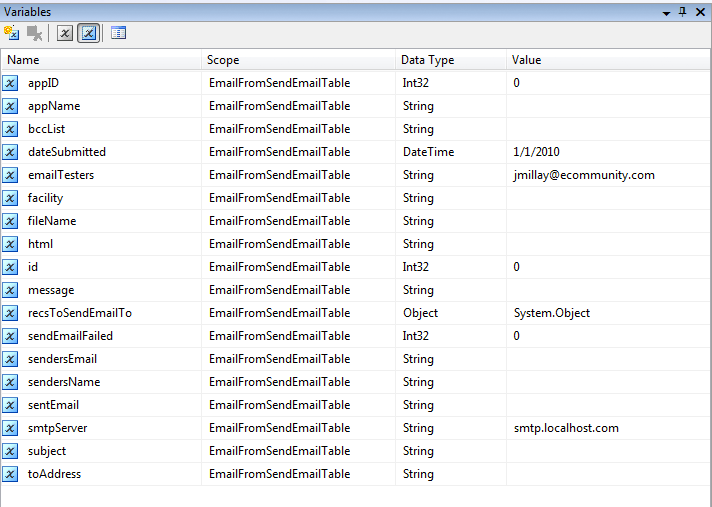 NOTE: You may not be able to read all the variables in figure 8- for those who are trying to "create along at home" here are the variables that are in that list: emailTesters,smtpServer, recsToSendEmailTo, id, dateSubmitted, sentEmail, sendersEmail,toAddress, message, subject, facility, fileName, sendersName, html, appID, appName,bccList.