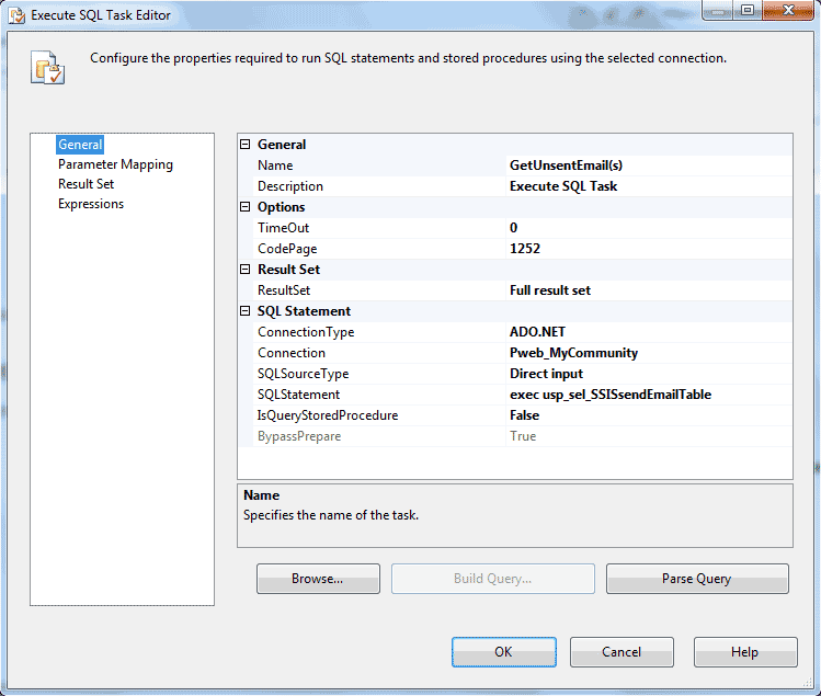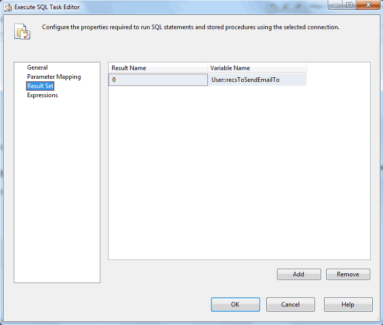Take a look at the two screenshots of the Execute SQL Task Editor for the GetUnsentEmail(s) task (figures 3 and 4). The configuration is potentially confusing because of the editor's use of the term "Result Set" to label multiple configuration items. This task is configured by selecting "General" on the left (refer to figure 3), then on the right, set "ResultSet" to "Full result set" (and set the other necessary properties--SQLStatement,SQLSourceType and Connection).