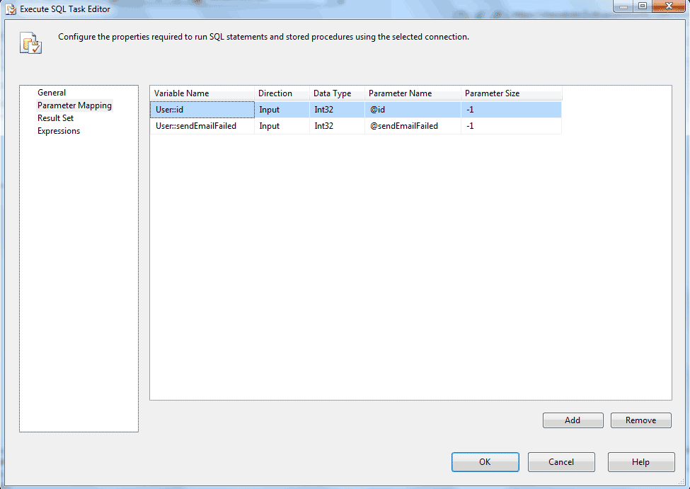 Figure 10 shows how the "Parameter Mapping" is set up. Two package variables (User::ID and User::sendEmailFailed) are mapped to parameters of the sql task (@id and @sendEmailFailed). The parameters of the sql task are passed to the parameters of the stored proc via the sql statement's "@id = @id, @sendEmailFailed = @sendEmailFailed."