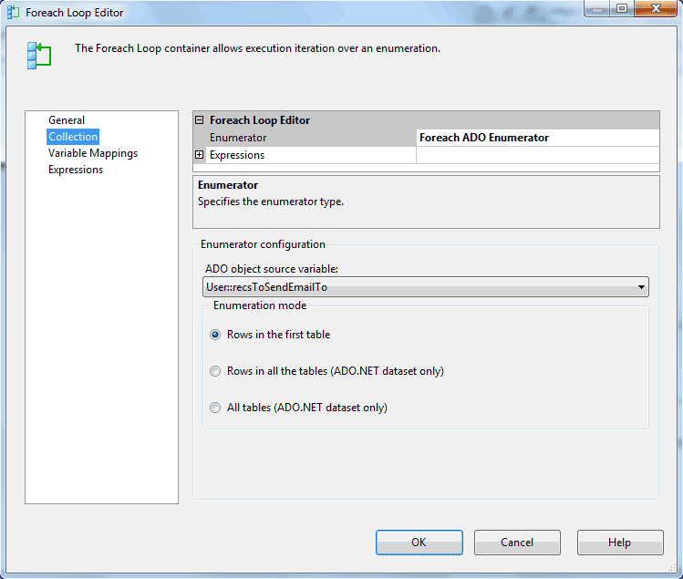 The properties of the Foreach Loop Container are somewhat tricky to set up. In the "Collection" configuration of the Foreach Loop Editor (figure 6) the enumerator is "Foreach ADO Enumerator" and the User::recsToSendEmailTo variable is the "ADO object source variable."