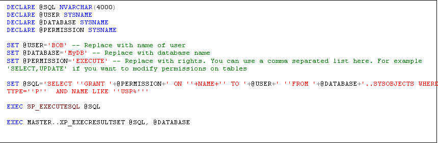 DECLARE @SQL NVARCHAR(4000) SET @SQL='SELECT ''GRANT EXECUTE ON ''+NAME+'' TO Bob ''FROM MyDB..SYSOBJECTS WHERE TYPE= ''P'' AND NAME LIKE ''USP%''' PRINT@SQL