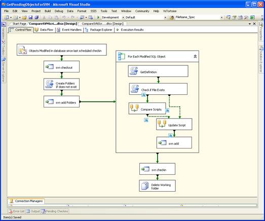 There are few other ways you could implement the same process based on what tools are available to you and also what programming language you prefer working in. If you have Redgate SQL Compare tool, you can replace the “For Each Modified SQL Object” with Execute Process tasks that run the required SQL Compare command line instructions. You will not need to loop through each object at that point. You can send the list of names in xml file as input to the command line. You could also use a console application to build the same process. But whatever be the method, I think it will be worth the while as it makes it easier to version control your database code. Please make sure you test these packages before you use them. This package has been developed using Visual Studio 2005. You will need to customize them to suit your environment