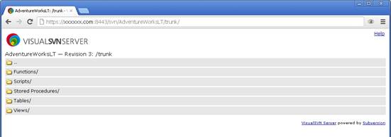 If you right click on the AdventureWorksLT repository and click browse you should be seeing the AdventureWorksLT folder in a browser. Once you click on the folder you will see the subfolders as shown in the picture below. Based on how the subversion authentication is setup, you might be asked for the credentials before you see the page. Once the scripts are stored, you will also be able to browse the script file from here.