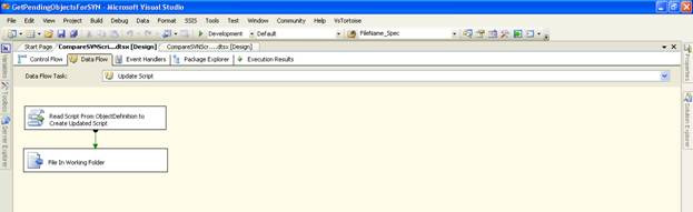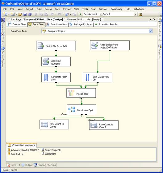 This data flow task reads the file from the working directory and compares with the object definition obtained from the database. It compares the code line by line using a Merge Join. You can even design a better way of comparing line by line by writing a script transformation to perform the comparision where you can ignore empty lines in the code or in the file.