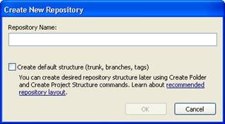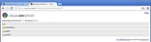 A new repository needs to be created using the Visual SVN server manager before we can store our scripts. Enter the name of the repository (AdventureWorksLT) and select the check box. It will create subfolders trunk, branches and tags under the AdventureWorksLT folder.
