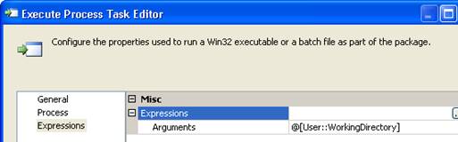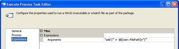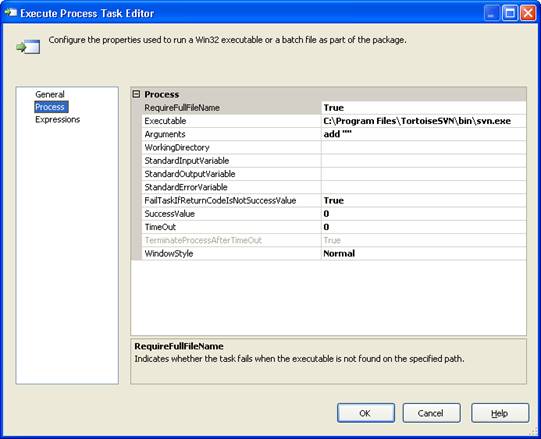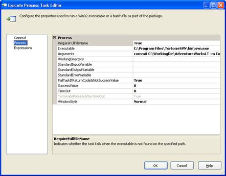 In the Execute Process task, AdventureWorksLT repository is checked out from SVN using command line. The path for the Executable may be different based on your TortoiseSVN installation.