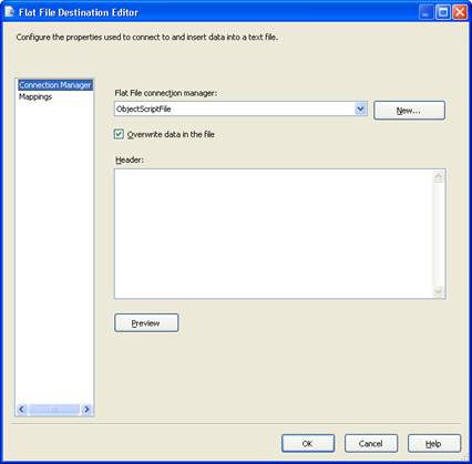 In this data flow task, same script component that is used in the earlier dataflow is used to read the script from the database. The only part that is different within this script component is that there is no RowNumber output column. This Data Flow task overwrites the script file in the Working folder