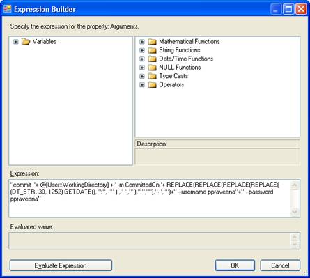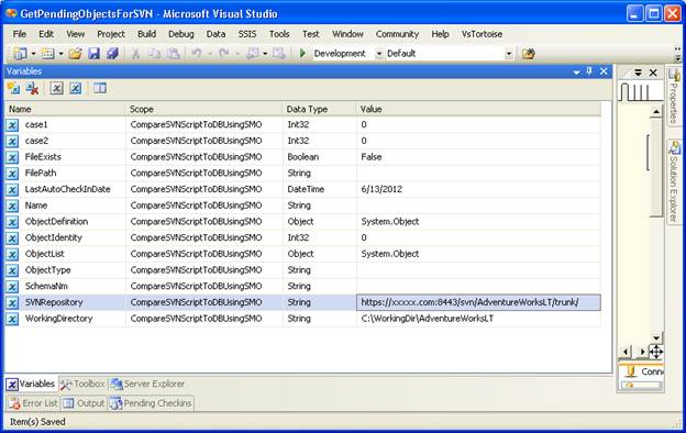 The list of variables used in the package is shown below. Please change the values of the SVNRepository, WorkingDirectory, LastAutoCheckInDate based on the environment setup you have. If you don’t have any code within sourcesafe yet or if you are running the package to set up the initial version, you can choose LastAutoCheckInDate such that all the objects for the database are selected.