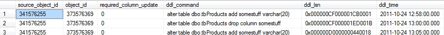 Now we have added a column, dropped it and re added it again. If we look at the table cdc.dbo_tbProducts_CT we will not see the change history. To track the DDL changes, we have to query cdc.ddl_history. When we execute the following query we will see the change history.