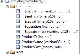 The newly created table, cdc.dbo_tbProducts_CT, will have all the changes that will be made on the tbProducts table. This table will have all the columns from the table tbProducts and five new columns as shown in the figure.