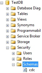 As soon as we run this command it will create a new schema, named cdc, inside the user database. If we expand the user database in the object explorer in SSMS, we will see that a new schema has been created, as shown in the image below.
