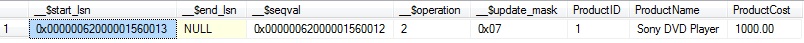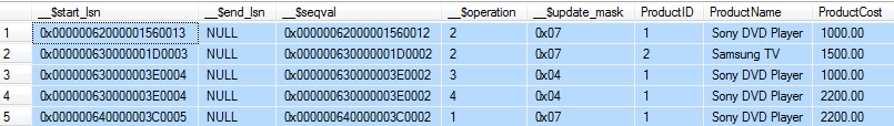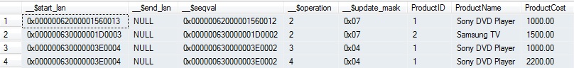 Select __$start_lsn, __$end_lsn, __$seqval, __$operation, __$update_mask, ProductID, productname, ProductCost from cdc.dbo_tbProducts_CT