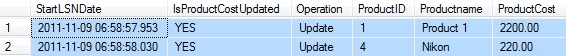 from cdc.fn_cdc_get_all_changes_dbo_tbProducts(@StartLSN, @EndLSN, 'all') ;The results will look something like this: