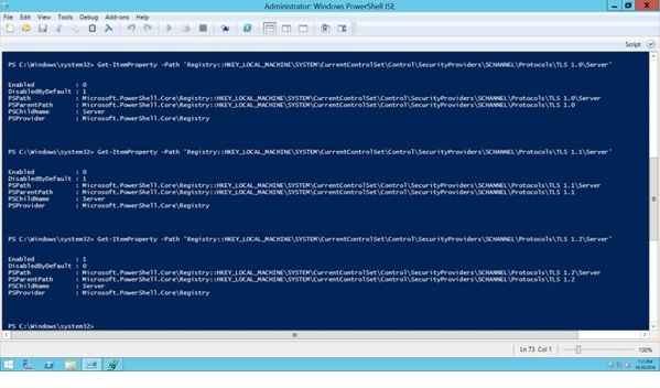 # -- Listing 1 Get-ItemProperty -Path 'Registry::HKEY_LOCAL_MACHINE\SYSTEM\CurrentControlSet\Control\SecurityProviders\SCHANNEL\Protocols\TLS 1.0\Server' Get-ItemProperty -Path 'Registry::HKEY_LOCAL_MACHINE\SYSTEM\CurrentControlSet\Control\SecurityProviders\SCHANNEL\Protocols\TLS 1.1\Server' Get-ItemProperty -Path 'Registry::HKEY_LOCAL_MACHINE\SYSTEM\CurrentControlSet\Control\SecurityProviders\SCHANNEL\Protocols\TLS 1.2\Server'