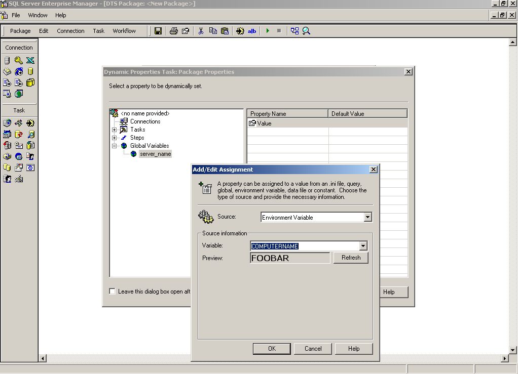 where <servername> should be replaced by the MS SQL Server name where the DTS package is located, "DTSConfig" the shared directory and "dw_load.ini" the INI file. This value could be fetched easily by using a Dynamic Property Task with an assignment to a global variable using the value from the Environment Variable COMPUTERNAME.
