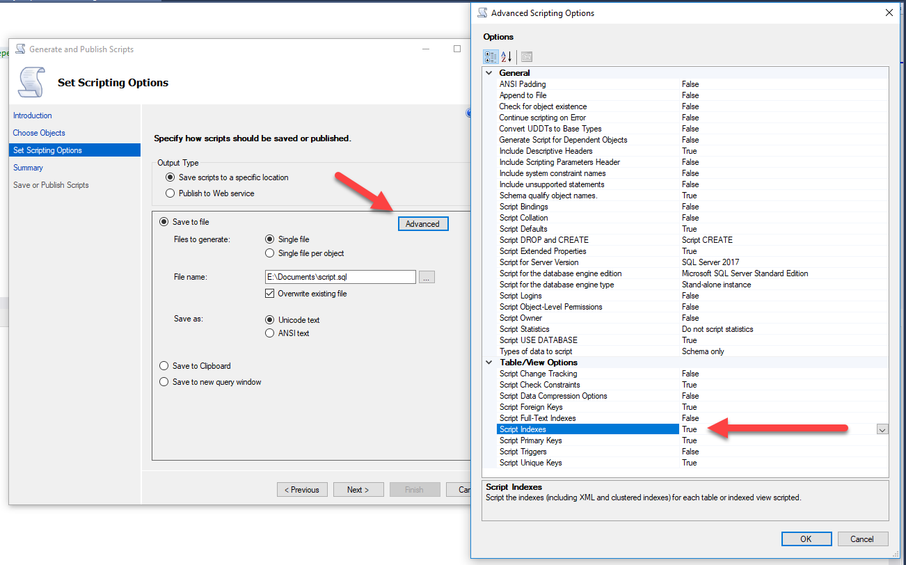 Additionally if you click the “Advanced” button in the final page of the dialog, you will receive many more options for how your objects will get scripted, including the ability to script out the indexes!