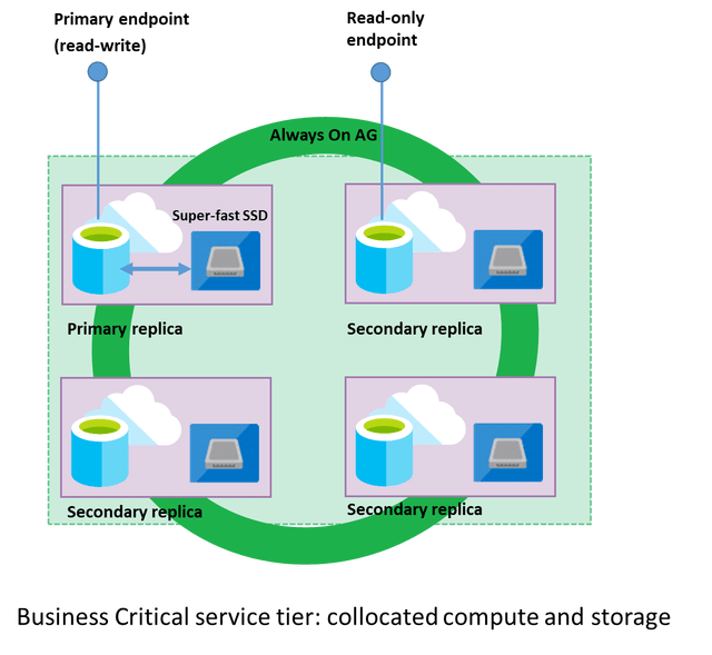 In the premium/business critical model, Azure SQL database integrates compute and storage on the single node. High availability in this architectural model is achieved by the replication of compute (SQL Server Database Engine process) and storage (locally attached SSD) deployed in a Always On Availability Groups cluster with enough replicas to achieve quorum and provide HA guarantees (currently 4 nodes as shown below):