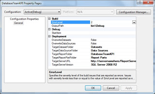 To do this right click DatabaseTeamKPI top level in solution explorer (see below) and select properties;