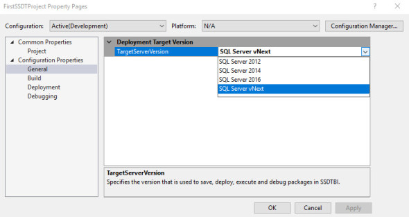 Under Configuration Properties -> TargetServerVersion you’ll see a drop down allowing you to set the version to SQL 2012 to SQL vNext. I’m going to select 2012.