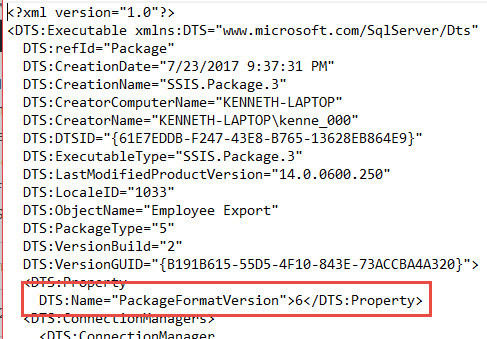 Now if you take a look at the dtsx file (remember that the ispac file is just a zip file) you’ll see that the packageformatversion is now 6.