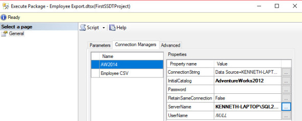 Since I had this pointing to my 2016 instance and AdventureWorks2014 I am going to modify those properties of the connection manager.