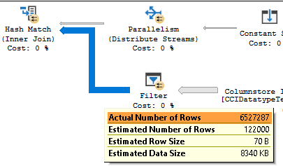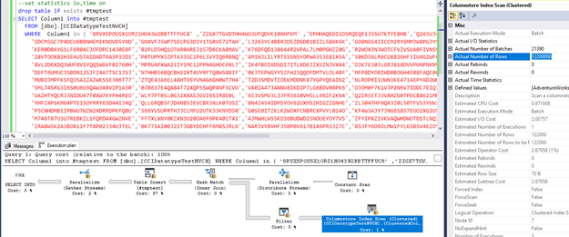 This is different exec plan than for INT data type. We can see all 12.2 mio records as an output of Scan operation. In this case, predicate pushdown of hash match results was not possible due to the probe values for s strings when hashing. Therefore, new operator – Filter is introduced in our plan to apply string filter. Let’s see some details of the filter operator: