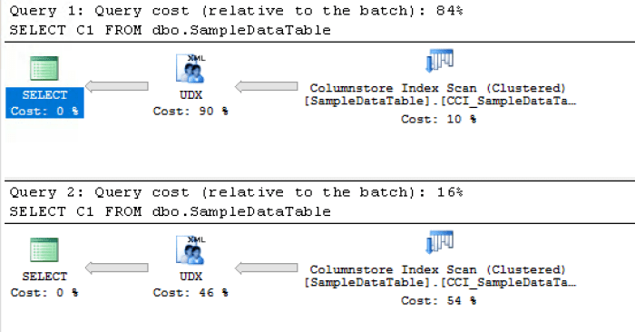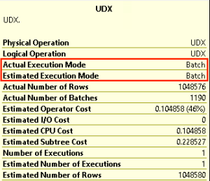Take a look at the details of each of the iterators, where the UDX in SQL Server 2016 is running in Row Execution Mode, and the UDX in SQL Server 2017 is running in Batch Execution Mode: