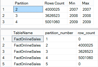 ON ColumstorePartitioning (DateKey);To check if everything is correct, I suggest using the following queries, displaying the number of rows per partition and the respective minimal year as the maximum year, stored within each of the partitions: