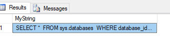 -- Setup DECLARE @MyString varchar(8000); SET @MyString = 'SELECT * FROM sys.databases WHERE database_id = 4' ; SELECT @MyString;