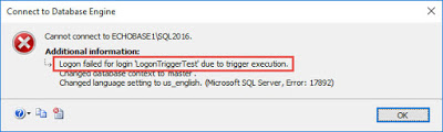 As you can see, we are denied access to the server because of the logon trigger. If we look in the Errorlog, we can see that we lack the VIEW SERVER STATE permission.