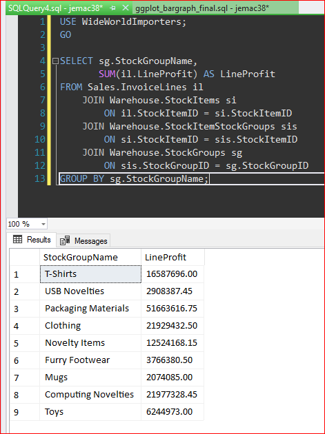 SELECT sg.StockGroupName,SUM(il.LineProfit) AS LineProfitFROM Sales.InvoiceLines ilJOIN Warehouse.StockItems siON il.StockItemID = si.StockItemIDJOIN Warehouse.StockItemStockGroups sisON si.StockItemID = sis.StockItemIDJOIN Warehouse.StockGroups sgON sis.StockGroupID = sg.StockGroupIDGROUP BY sg.StockGroupName;