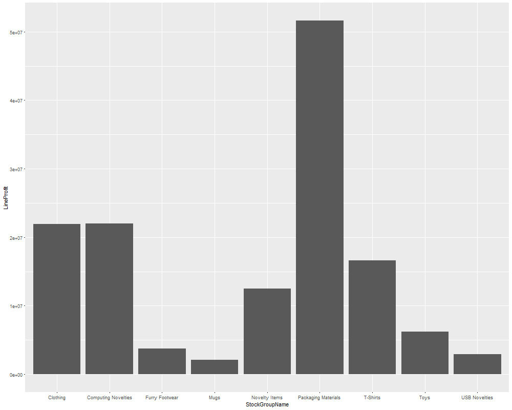 EXEC sp_execute_external_script @language = N'R',@script = N' library(ggplot2); chartStockGroupProfit <- "C:\\Marlon_test\\StockGroupProfit.png" png(filename=chartStockGroupProfit, width=1000, height=800) StockGroupProfit <- InputDataSet StockGroupProfitChart <- ggplot(data=StockGroupProfit, aes(x=StockGroupName, y=LineProfit)) + geom_bar(stat="identity") print(StockGroupProfitChart)', @input_data_1 = N' SELECT sg.StockGroupName, SUM(il.LineProfit) AS LineProfitFROM Sales.InvoiceLines il JOIN Warehouse.StockItems si ON il.StockItemID = si.StockItemID JOIN Warehouse.StockItemStockGroups sis ON si.StockItemID = sis.StockItemID JOIN Warehouse.StockGroups sg ON sis.StockGroupID = sg.StockGroupIDGROUP BY sg.StockGroupName;';