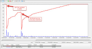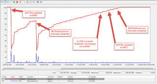 The red line is the Working Set of SQL Server and the blue line is the Page Faults/sec for SQL Server. The first dip in the red line was from the DAT file update, and the second dip was when I manually restarted the McShield service. Since SQL Server’s buffer pool had just been paged out, it needed to read those pages from disk which results in a page fault.