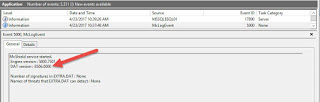 After giving HammerDB a few minutes to generate some activity, I issue a manual DAT file update through the McAfee GUI. The application log shows the Event ID 5000 with a new DAT version of 8507, but no record of Event ID 17890 and there was nothing in the SQL Errorlog about memory paging.