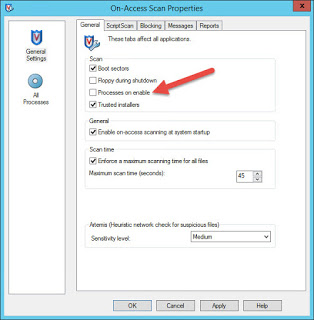 Enabling this option causes memory pages of running processes to get paged to disk. And the example given is “Oracle, SQL, or other critical applications that need to be memory-resident continually, will have their process address space paged to disk when scan Processes On Enable kicks in”. OUCH! So when the McAfee service starts up or it gets a new DAT file, it will page out all processes.