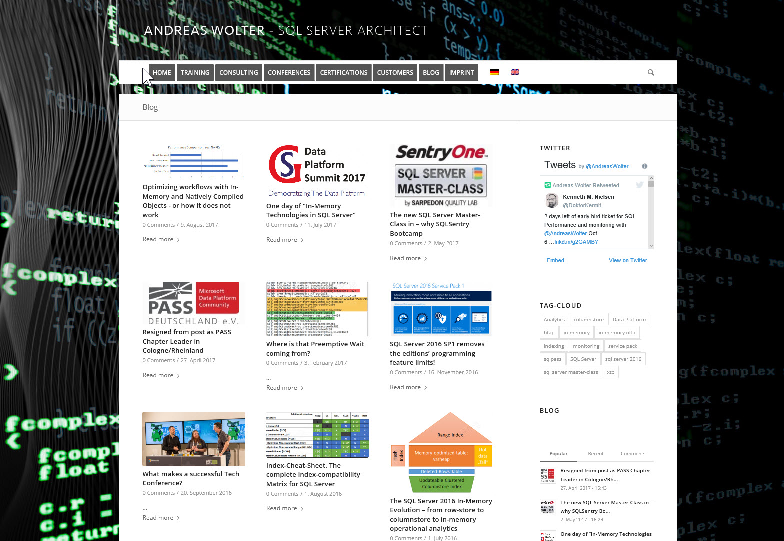 Mein aktueller Artikel, der erstmalig ausschließlich auf der neuen Website zu finden ist, lautet: Optimieren von Workflows mit In-Memory und nativ kompilierten Objekten - oder wie es nicht funktioniert | My currently last article, which is exclusively available at the new website for the first time, is Optimizing workflows with In-Memory and Natively Compiled Objects - or how it does not work |