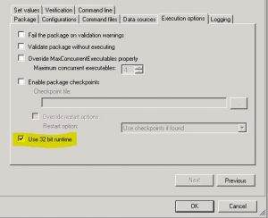 Microsoft (R) SQL Server Execute Package Utility Version 11.0.6020.0 for 64-bit Copyright (C) Microsoft Corporation. All rights reserved. Started: 2:02:37 AM Error: 2016-12-19 02:02:37.91 Code: 0xC0209303 Source: ExcelImpot Connection manager “SourceConnectionExcel” Description: The requested OLE DB provider Microsoft.ACE.OLEDB.12.0 is not registered. If the 64-bit driver is not installed, run the package in 32-bit mode. Error code: 0x00000000. An OLE DB record is available. Source: “Microsoft OLE DB Service Components” Hresult: 0x80040154 Description: “Class not registered”. End Error Error: 2016-12-19 02:02:37.91 Code: 0xC001002B Source: MAPTImpot Connection manager “SourceConnectionExcel” Description: The ‘Microsoft.ACE.OLEDB.12.0’ provider is not registered on the local machine. For more information, see http://go.microsoft.com/fwlink/?LinkId=219816 End Error Error: 2016-12-19 02:02:37.91 Code: 0xC020801C Source: Data Flow Task 1 Source – Sheet1$ [38] Description: SSIS Error Code DTS_E_CANNOTACQUIRECONNECTIONFROMCONNECTIONMANAGER. The AcquireConnection method call to the connection manager “SourceConnectionExcel” failed with error code 0xC0209303. There may be error messages posted before this with more information on why the AcquireConnection method call failed. End Error Error: 2016-12-19 02:02:37.91 Code: 0xC0047017 Source: Data Flow Task 1 SSIS.Pipeline Description: Source – Sheet1$ failed validation and returned error code 0xC020801C. End Error Error: 2016-12-19 02:02:37.91 Code: 0xC004700C Source: Data Flow Task 1 SSIS.Pipeline Description: One or more component failed validation. End Error Error: 2016-12-19 02:02:37.91 Code: 0xC0024107 Source: Data Flow Task 1 Description: There were errors during task validation. End Error DTExec: The package execution returned DTSER_FAILURE (1). Started: 2:02:37 AM Finished: 2:02:37 AM Elapsed: 0.733 seconds. The package execution failed. The step failed.