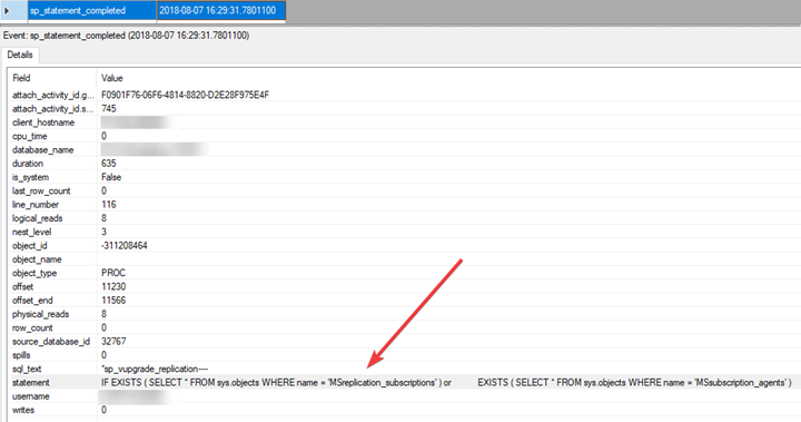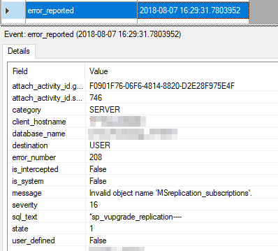 The upgrade scripts failed even when run manually, which was not a surprise. Fortunately, this time we were able to catch some interesting data in XE session where we found the exact same error as in an errorlog: