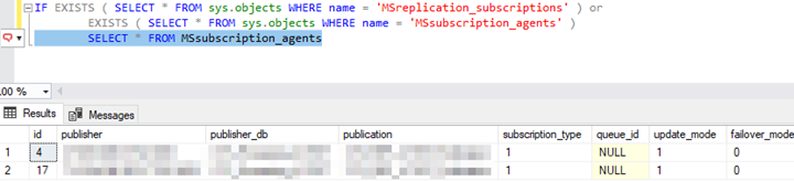 (SELECT * FROM sys.objects WHERE name = ‘MSsubscription_agents’)