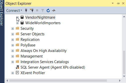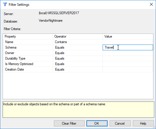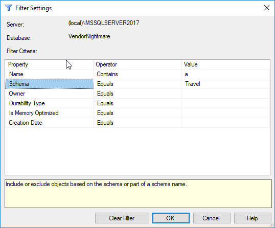 SSMS will even tell me that my list of objects is filtered so I don’t go crazy later on wondering where all of my other tables went.