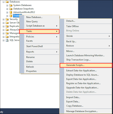 - In order to perform this process, First open SQL Server database. Now, right-click on the Database. Select the options Task and then click Generate Scripts.