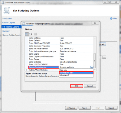 - For the option ‘types of data to script’, choose ‘Schema and data’ from the drop-down menu. Then click OK>> Next.