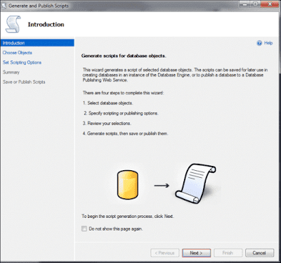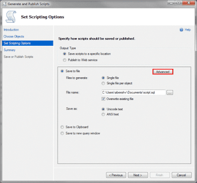 - Click on Finish when it is done generating scripts. You can check the script file now and run it if needed.
