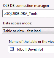 In the OLE DB Destination Editor, set the OLE DB connection manager to the DBA_Tools connection created earlier and pick the DriveInfo table from the table or view drop down.