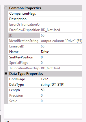 Double click on the Script Component to open the editor. Now let’s add some output columns. Rename Output 0 to DriveInfo and add the columns: